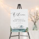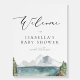 This baby shower welcome foam board sign features a watercolor mountain lake scene with pine trees and an elegant script font. Easily change *most* wording to match your event needs.