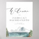 This bachelorette welcome sign features a watercolor mountain lake scene with pine trees and an elegant script font. Easily change *most* wording to match your event needs.