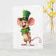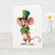 This card features a light brown, human-like mouse standing against a plain white background, dressed up for St. Patrick’s Day with a tall emerald-green top hat topped by a gold buckle. Around its neck sits a thick garland of green four-leaf clovers ☘️, arranged like a soft collar that frames its face the way a friendly hug might. The mouse’s rosy pink ears, nose, and paws add a gentle contrast, and its wide brown eyes and open smile make it look like it’s greeting someone it’s glad to see 💚. Its hands rest on its hips in a confident, teasing pose, as if it’s showing off for a close friend or a sweetheart just out of view. The lighting is even and soft, giving the mouse and accessories a smooth, slightly sculpted look without harsh shadows. The greeting “Happy St. Patrick’s Day” appears near the top in green lettering, balanced neatly above the character. The clover garland is the main focal detail, with each leaf clearly shaped and layered in rich green tones.