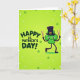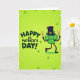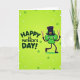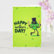 The front design shows a friendly four-leaf clover character centered on a lime-green gradient background, smiling with wide eyes and a sweet, welcoming look that feels like it’s meant for a close friend 💚. It wears a black top hat with a gold buckle, giving it a dressed-up St. Patrick’s Day style. Thin, dark arms and legs stretch outward as if it’s mid-dance, holding a brown stick in each hand like drumsticks raised for a little parade beat. To the left, the message “HAPPY ST. PATRICK’S DAY!” appears in deep green letters with a soft glow around the text. A faint halo-like light also surrounds the clover, tying the lettering and character together and adding a gentle, magical touch ☘️. Small four-leaf clovers float across the background like confetti, and tiny white sparkles are sprinkled around them. The scene is filled with scattered mini clovers and bright pinpoints of white light against the green backdrop.