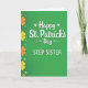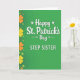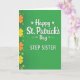 This greeting card features a rich emerald-green background with a gentle gradient that gives the surface a soft glow, like light moving across a grassy hillside 💚. Centered on the front, the main line reads “Happy St. Patrick’s Day” in large white lettering, with tiny shamrocks and small arrow accents tucked around the word “Day” ☘️. Just beneath, “STEP SISTER” appears in uppercase white text, spaced neatly so it feels like a direct note to someone close. Along the left edge, a vertical border of four-leaf clovers creates a steady frame, mixing larger solid shapes with smaller outlined ones. The clovers shift through warm amber and sunny yellow, then back to lighter greens, adding contrast against the deep background. The layout feels like a friendly, affectionate nudge—like you’re leaning in to say it with a smile—while keeping everything crisp and easy to read. The white text sits cleanly in the center, and the clover border stacks from top to bottom in alternating sizes and colors.