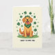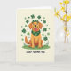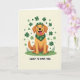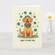 This card shows a golden retriever sitting attentively in the center, its goldenrod-and-amber fur softly shaded to look touchable and warm. The dog’s open-mouthed grin and pink tongue feel like a friendly hello, as if it’s gazing at someone it trusts. A bright green clover headband rests on its head, and a shamrock-patterned bandana is tied around its neck, adding a cozy St. Patrick’s Day touch 💚. The background is a creamy off-white with gentle, diffused lighting that keeps the focus on the dog and the greens. Clover shapes float above and around it like light confetti, mixing classic three-leaf forms with smaller green accents ☘️. Beneath the paws, the phrase “LUCKY TO HAVE YOU” is placed near the bottom in dark lettering, with a small patch of rich green grass and fine blades grounding the scene.