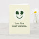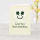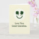 This greeting card centers a simple circular badge on a creamy yellow, lightly textured background that looks like parchment. Inside the off-white circle, a smiling face appears, with two deep forest green four-leaf clovers for eyes that seem to gaze outward like a sweet, knowing glance ☘️. A matching green curved line forms the mouth, giving the face a gentle grin that feels like a quiet bond between loved ones. Beneath the circle, the message “Love You Great Grandma” sits in a serif font, set in the same green and aligned neatly under the emblem 💚. The roomy space around the design keeps everything calm and focused, as if the little face is letting the words do the talking. The limited palette—soft yellow and rich green—keeps the scene warm and steady, with the clover eyes acting like tiny lucky charms. The circle’s edge stays soft and off-white, while the clovers and text stand out in deep green against the creamy field. A friendly way to share St. Patrick's Day sentiments.
