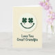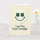 This card features a soft, creamy vanilla background with a large white circle in the center that looks slightly raised by a gentle shadow. Inside the circle is a simple smiling face, where two dark emerald four-leaf clovers act as the eyes, adding a sweet little nod to St. Patrick’s Day ☘️. The curved smile beneath them is drawn in the same deep green, giving the face an easy, affectionate look, like it’s beaming at someone it cares about. Just below the circle, the words “Love You Great Grandpa” sit centered on the page in a rounded sans‑serif style. The text is also dark green, matching the clover eyes and smile for a calm, coordinated feel 💚. With lots of open space and only a few elements, the design keeps attention on the gentle grin and the loving message. The main visual focus remains the white medallion-like circle, with the green clovers and smile standing out crisply against the pale background.