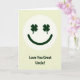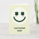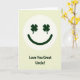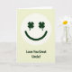 This card shows a simple smiling face centered inside a soft off-white circle on a pale chartreuse background, giving the whole design a calm St. Patrick’s Day look 💚. The “eyes” are two dark emerald four-leaf clovers, angled slightly outward like they’re leaning toward each other in a friendly, affectionate glance ☘️. Below them, a thick curved smile in the same deep green sweeps across the lower half of the circle, like a warm grin meant just for someone special. Under the face, the message “Love You Great Uncle!” sits centered in dark green lettering, easy to spot against the light background. The text is placed just beneath the circle, with enough spacing that it feels relaxed and uncluttered. The limited color palette—chartreuse, off-white, and emerald—keeps the focus on the clover eyes and the gentle curve of the smile. Share your St. Patrick’s Day greetings with someone you care about. The clover stems curve outward, and the smile arc mirrors their shape in matching green.