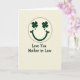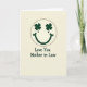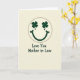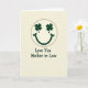 This card features a retro-style smiling face where two deep forest-green four-leaf clovers form the eyes, with a matching curved smile beneath them ☘️. The background is a creamy, parchment-like tone that makes the green details stand out while keeping the look soft and warm. The round face sits in the upper half of the front, leaving open space below like a quiet pause before the message. Centered underneath, the text reads “Love You Mother in Law” in a slightly rounded sans-serif font, printed in the same rich green 💚. The friendly clover “eyes” feel like they’re gazing down toward the words, giving the design a gentle, affectionate connection. The simple shapes and steady spacing keep everything balanced, like a calm little moment shared between family members. The clovers are evenly sized and angled, and the smile is a smooth arc that mirrors the curve of the circular face.