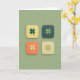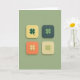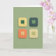 This greeting card features four stylized four-leaf clovers set on softly raised squares, arranged in a neat 2x2 grid against a calm sage green background 💚. Each clover has heart-shaped leaves and a slim stem, like small tokens passed between close friends with an easy, affectionate look. The top-left square is pastel yellow with an emerald green clover, while the top-right square is muted deep teal with a lighter fresh green clover ☘️. On the bottom row, a warm coral square holds a creamy pale yellow clover, and a soft beige square carries a gentle light green clover. Soft, diffused lighting creates mild shadows around the rounded corners, giving the shapes a quiet 3D lift without feeling busy. A short St. Patrick’s Day greeting sits centered above the grid in white, with a smaller line placed below in a darker green to match the background. The four rounded squares sit evenly spaced, with crisp edges and gentle shadowing that makes each clover stand out.