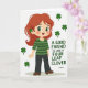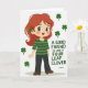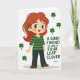 This card features a ginger-haired girl with emerald eyes and an open-mouthed smile, standing on the left as if she’s just turned toward a close friend. Her auburn hair falls in soft curves, and a single four-leaf clover is tucked behind her ear like a sweet little nod to someone special ☘️. She wears a horizontally striped shirt in layered greens, set against a bright white background sprinkled with small, deep forest-green clovers. The scene feels friendly and a bit romantic in a gentle way, like the smile you share when you’re in on the same lucky secret 💚. On the right side, green lettering is stacked in clear lines and reads, “A GOOD FRIEND IS LIKE A FOUR LEAF CLOVER.” The text sits comfortably in the open space, balancing her figure and drawing your eye across the page. Scattered clovers dot the background around both the girl and the words, with the darkest ones standing out most against the white.