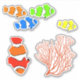 Clown fish stickers with sea coral. Fun party stickers for kids in bright, primary colors. Give as favors at "under the sea" themed birthday parties, or add to envelopes, packages or scrapbook pages.