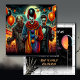 Halloween party invitations. Scary clown, vampire and zombies holding orange and black balloons in front of a full moon Halloween party invites done in a comic book eerie carnival style.