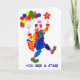 A bright and cheerfull greeting card that can be used as a 'thank you' note or a 'congratulations' card as it is left blank inside for your own message. The colorful handpainted paper collage design is of a jolly clown with balloons and a star. See also matching gifts and apparel.