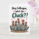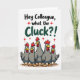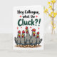 This card shows five simplified, humanlike chickens lined up along the bottom, their dark gray feathers set off by bright red combs and wattles, with yellow beaks, feet, and wide eyes that make them look like they just shared the same surprising joke. Their close spacing and slightly tilted heads suggest a friendly, in-on-it moment, like coworkers trading a teasing glance 🐇. Across the upper half, large chunky lettering reads, “Hey Colleague, what the Cluck?!”, arranged in a loose arc so the words hover above the birds. The text is mostly dark gray, with small red starburst marks sprinkled around it like comic-style emphasis 🌷. A plain white background keeps the focus on the characters and the message, while thin outlines and light shading add depth without crowding the page. The birds stand on a warm, earthy strip of ground that runs horizontally beneath their feet. Little red bursts sit near the punctuation and around the top lettering, echoing the red accents on the chickens’ heads.