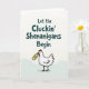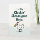 This card features a tall, vertical layout with dark teal text across the top reading “Let the Cluckin’ Shenanigans Begin,” set in an uneven, casual hand-drawn style. Beneath the headline, a cartoon hen stands front and center, its white feathers edged in crisp black lines that give it a lively, animated look. The hen’s red comb and wattle add a warm accent, and its sideways glance feels like a friendly nudge shared between close pals. Clamped in its beak is a small bottle with a yellow label, like a cheeky little secret being passed along ☘️. The cool teal and green tones keep the scene calm while the hen’s pose suggests a light, conspiratorial energy, as if it’s inviting someone special to join in. The text stays at the top in dark teal while the illustration fills most of the space below, leaving breathing room around the character 💚. Along the bottom, a soft green wash fades across the page like a simple patch of grass under the hen’s feet.