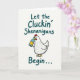 This card shows a plump white cartoon chicken centered on a white background, outlined in black with a red comb and wattle, holding a pale blue bottle with a golden-yellow label tucked under its wing. The chicken’s slight head tilt and sideways glance suggest it’s sharing a private joke with someone close, like a friend leaning in before a toast 💚. Curved teal text sits above the character reading, “Let the Cluckin’ Shenanigans Begin...,” with matching teal lettering arcing below to frame the scene. The rounded lettering stands out crisply against the white space, keeping your eyes on the chicken and its cheeky prop ☘️. Simple shading and minimal details give the bird an easygoing, cartoon look, while the bottle adds a wink of celebration. The open background leaves plenty of breathing room, making the central figure feel like it’s stepping forward to include the viewer in on the fun. The bottle’s pale azure body and bright yellow label sit snugly beneath the chicken’s wing at the center of the design.