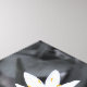 This photographic design features a black and white macro photo of a cluster of tiny wildflowers. There is a subtle hint of yellow in the centers of the blooms and a stripe of purple on the petal undersides. The leaves and foliage are in gray and black to keep the focus on the flowers. If you look really close, you'll see a surprise in one of the tiny blooms!