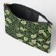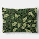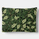 A foliage print with a light almost olive green or sage leaves interwoven into darker greens. A shade of hunter green or a dark forest green creates the large majority of the leaves. These on a background of black.