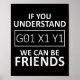 This funny funny cnc machinist design reads "if you understand g01 x1 y1 we can be friends".The design features a g code.