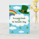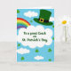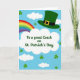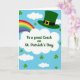This greeting card features a bright blue sky with a large white cloud centered like a soft frame, holding the message “To a great Coach on St. Patrick’s Day” in green lettering. A rainbow sweeps in from the left, its bands curving toward the middle as if guiding the eye toward the greeting. In the upper right, a deep emerald leprechaun hat floats with a black band and a gold buckle, giving the scene a classic holiday touch. Small white clouds dot the background, and bright green shamrocks are sprinkled around like confetti ☘️. The simple shapes and flat color areas keep everything easy to read, while the coach message sits snugly in the cloud as the clear focal point 💚. The layout feels friendly and appreciative, like a warm nod from a team that’s gathered just off-screen under the rainbow. Tiny shamrocks cluster near the cloud’s edges, with extra leaves drifting across the open blue space.