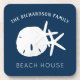Entertain your guests at your beach house or beach party event with these personalized coastal starfish and sand dollar coasters, with a navy blue background.