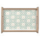 A blue and white serving tray with a sand dollar pattern on a rustic wood background. Designed for you by Blackberry Boulevard.