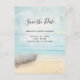 Save the date postcard with a beautiful rustic image. Subtle colors of light blue, sandy brown and gentle white. A beach scene with a boat on the shore and a faded lighthouse off in the distance with birds flying around. An elegant shabby look.