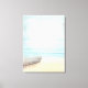 Canvas print with a beautiful rustic image. Subtle colors of light blue, sandy brown and gentle white. A beach scene with a boat on the shore with a fishing net hanging off the side. An elegant shabby look.