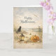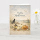 A soft, coastal-inspired Halloween illustration that blends autumn charm with seaside calm. Set along a sandy shore beneath a pale, cloud-drifted sky, a black cat gazes toward the sea while gulls glide overhead and a small rowboat rests near the water’s edge. In the foreground, heirloom pumpkins—including a cheerful jack-o’-lantern—sit beside a glowing lantern, seashells, and a starfish nestled among dune grasses and wildflowers. The muted, linen-textured palette and gentle “Happy Halloween” lettering create a peaceful, unexpected take on Halloween.