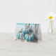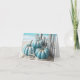 Ocean waves gently lap the sandy shore where three blue pumpkins rest beside a rustic wooden fence for a blank note card.