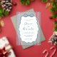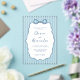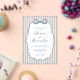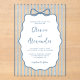This dusty blue and white whimsical coastal wedding acrylic invitation features a hand drawn scalloped frame with a bow on a background of watercolor stripes, and handwriting script.