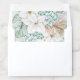 The perfect envelope liners for your beach wedding features a light and airy coastal design. This design has a watercolor image of a floral arrangement with a white poinsettia, blue hydrangea and tropical foliage. Colors used include, slate blue, forest green, ivory and tan.
