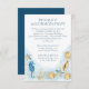 Romantic dusty blue and gold hand-painted nautical watercolor "under the sea" wedding collection. The design features seashells, starfish, a seahorse, and coral reef in complimenting shades of blue, gold, and off white with a splash of blue for a water effect. Your details in navy blue modern lettering are framed by the nautical watercolor garland border of elegant sea coral, shells and starfish.