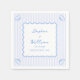 These napkins feature a charming coastal-inspired design with soft blue and white striped borders, delicate scallop shell illustrations in the corners, and a wavy frame enclosing elegant script text. The customizable names, date, and location make them perfect for a nautical, beach, or seaside wedding. The light blue color palette evokes a fresh and airy ambiance, ideal for a summer wedding in Nantucket, the Hamptons, or any coastal destination.