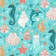 Ocean-themed Christmas wrapping paper with magical and whimsical underwater decorations like seahorses, shells, dolphins, and starfish. Bring a splash of enchantment under the tree this Christmas! Original artwork by Marketa Stengl.