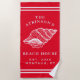 Coastal Conch Shell Beach House Family Name Red Beach Towel. Personalize this custom design with your own family name, year established, city and state. The perfect summer beach towels for your family lake house, cottage, or beach house.