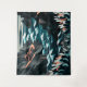 Coastal Energy: This vibrant flat vector illustration captures the dynamic beauty of a rocky beach from an overhead perspective. Dark blue and orange tones bring life to the scene as waves crash onto the shore, creating a captivating contrast. Geometric shapes add depth, while detailed textures on rocks and plants bring a natural feel to this stylized artwork. The minimalistic design emphasizes movement and energy, making it a perfect piece for those looking to add a bold and modern coastal vibe to their collection.