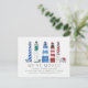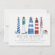 Colorful moving announcement featuring a row of red, white & blue lighthouses set on a white background with a coordinating back for an extra special touch.