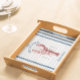 Coastal Lobster Seaside Beach House serving tray features a white background with a red watercolor style Maine lobster and navy blue rope stripes. Personalize it with your family name and the date established in a classic navy blue font. Perfect for summer beach homes and waterfront cottages.