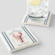 Coastal Lobster Seaside Beach stone coaster features a white background with a red watercolor style Maine lobster and navy blue rope stripes. Personalize it with your family name and the date established in a classic navy blue font. Perfect for summer beach homes and waterfront cottages.