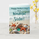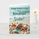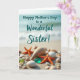 This card features a tall, beach-themed layout that pairs a sisterly Mother’s Day greeting with a calm seaside scene ❤️. Near the top, the message “Happy Mother’s Day to a Wonderful Sister!” sits centered in deep teal lettering against a softly blurred view of ocean meeting pale sand. The distant water and shoreline fade gently into the background, like a quiet morning where the light feels warm even without showing the sun. Below, the focus shifts to a close-up spread of seaside finds arranged on fine, sunlit sand, creating a cozy, caring mood through careful placement and soft shadows. Several orange sea stars stand out with grainy texture, nestled beside smooth shells in spiral and scalloped shapes that catch highlights along their edges. Small pieces of sea glass in teal and green add a jewel-like shimmer 🌼, scattered between the shells as if collected together during a slow walk. The deep teal text remains confined to the upper area, leaving the lower half as an uncluttered showcase of shells, sea stars, and glinting glass on warm sand.