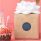 Round return address seal features your name and address in classic white lettering with a script accent, on a soft navy blue background. Designed to coordinate with our Coastal Blue Fish wedding and event collection.