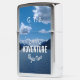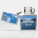 This lighter features a view of the coast from the ocean with islands and a blue sky with clouds, with the phrase "Let The ADVENTURE Begin Now" in a mix of a retro scripted font and a distressed block font, as well as a personalized triple monogram or name.