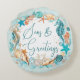 Coastal SEAS & GREETINGS Starfish Shells Round Pillow. Coastal or beach themed Christmas holiday season throw pillow featuring watercolor seahorses, starfish, shells and ornaments accented with faux glitter icons and the greeting SEAS & GREETINGS in modern handwritten script typography in turquoise, teal, golden brown and white on your choice of background color (shown in light turquoise). OPTIONS: The sample is shown on the 16-inch round pillow--other sizes, shapes and options are available on the ordering page or you can transfer the design to another product. ASSISTANCE: For help with design modification or if you would like coordinating items, contact the designer BEFORE ORDERING via the Zazzle Chat MESSAGE tab below or email makeitaboutyoustore@gmail.com.