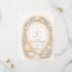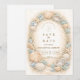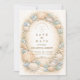 A refined coastal wedding design featuring an elegant oval wreath of seashells, oyster shells, starfish, and soft sea glass accents. Neutral sandy tones blend with muted ocean blues and delicate dune grasses to create a serene seaside aesthetic. The warm parchment background enhances the natural textures while maintaining a timeless, elevated feel. Perfect for a romantic beach celebration with classic coastal charm.