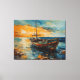 Oil painting depicting a weathered boat resting on a calm shore under a vibrant, cloud-strewn sky. Captures a sense of peaceful isolation and maritime beauty.