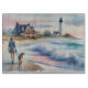 This dreamy coastal artwork captures a tranquil moment at the shoreline, where a woman strolls barefoot with her dog, the soft pastel tones of the setting sun casting a warm glow on the sand and sea. A charming beach house sits nestled among windswept grasses, its porch inviting and timeless, while a stately lighthouse watches over the horizon. Gentle waves roll in with watercolor softness, and hints of blush pink, misty blue, and sun-kissed gold give the scene an ethereal, nostalgic quality. The entire composition evokes slow living, serenity, and the quiet magic of coastal escapes. With a relaxed, coastal cottagecore vibe and a soft, painterly style, this piece blends warmth and whimsy in perfect harmony. AI generated artwork.