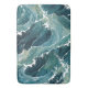A digitally created depiction of turbulent sea waves in various shades of blue and green with white highlights simulates the frothy crests of water. The stylized nature of the waves gives a sense of movement and the intricate layering of colors adds depth to the aquatic theme.