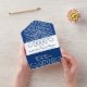 Dramatic, elegant design with deep sea blue and white featuring an abstract organic shape. This unique artistic all-in-one wedding invitation has coastal ocean vibes and all the essentials for your guests in one place: invitation and return RSVP card. The RSVP includes menu choices with three options. The main part of the invitation, which will stay with the guest includes the essential details with a place for your wedding website and a QR code so they can access any additional details.