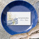This elegant wedding place card design features a stunning watercolor motif of dusty blue seashells and sea flowers, beautifully accented by delicate faux gold sea fans.
