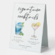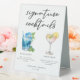 This chic coastal signature cocktails table tent sign features simple black typography above 2 seaside drinks and their ingredients for your beach wedding bar. A cute Blue Lagoon and Lemon Drop martini drawing add a cool flair to your bar menu. Complete with the couple's names and date for their reception.