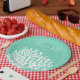 Coastal white coral themed paper plates with a sea glass green background color perfect for a summer beach wedding!
